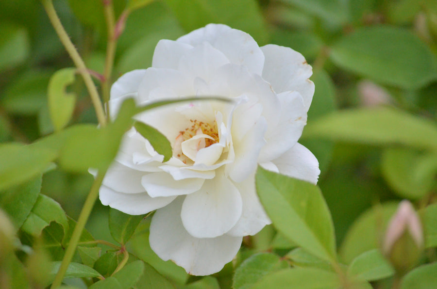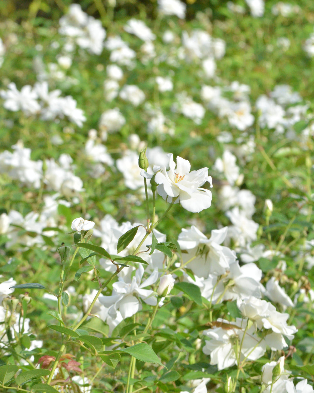 Close up of white roses with 5 petals. Cherokee rose bush.