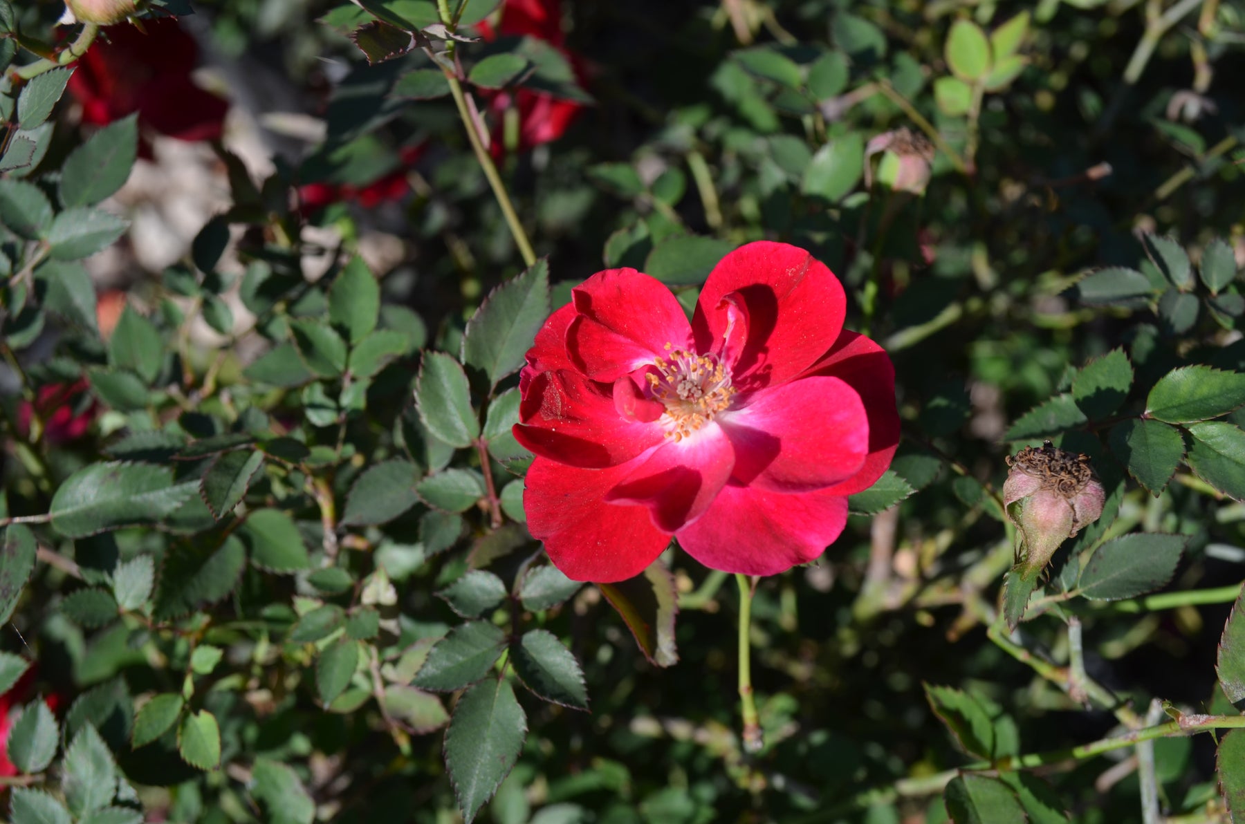 Bright scarlet, neat single flowers open flat to decorate a bushy shrub whose neat foliage has a dark red tinge. This is a handsome plant, and due to its size serves as an excellent choice for a low hedge or border. Our original cuttings come from a Navasota gardener, Martha Gonzales, whose display of ‘Mrs. Dudley Cross’, ‘Old Blush’ and this rose could be seen from blocks away. ‘Martha Gonzales’ has become very popular with area landscapers for mass plantings and large drifts.