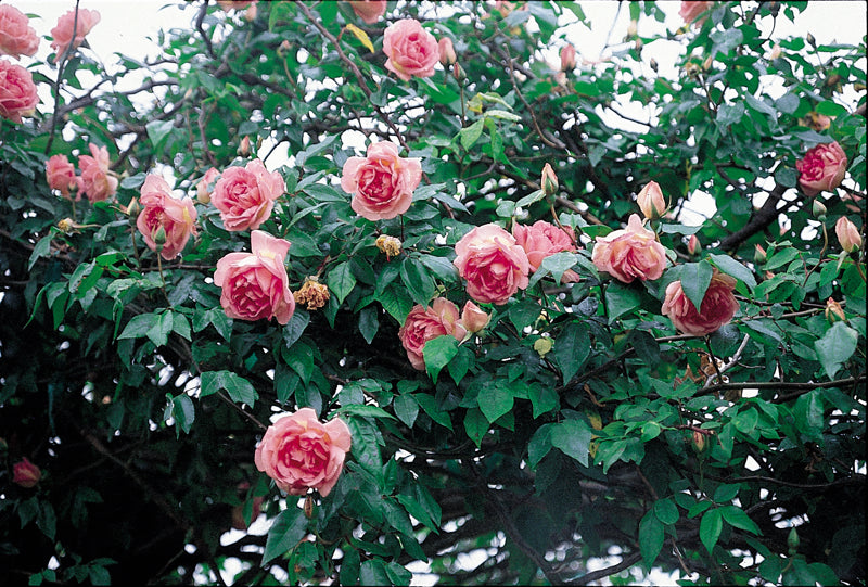 Fans of our found rose, study-named "Climbing Lady Pamela" will be interested to know that with much help from expert rosarians we have identified it. By its new name it still smells sweet, with honey-scented flowers of cream-yellow washed with pink covering the entire plant in wild profusion several times each spring. 'Souvenir de Mme. Leonie Viennot' is one of our most vigorous climbers.