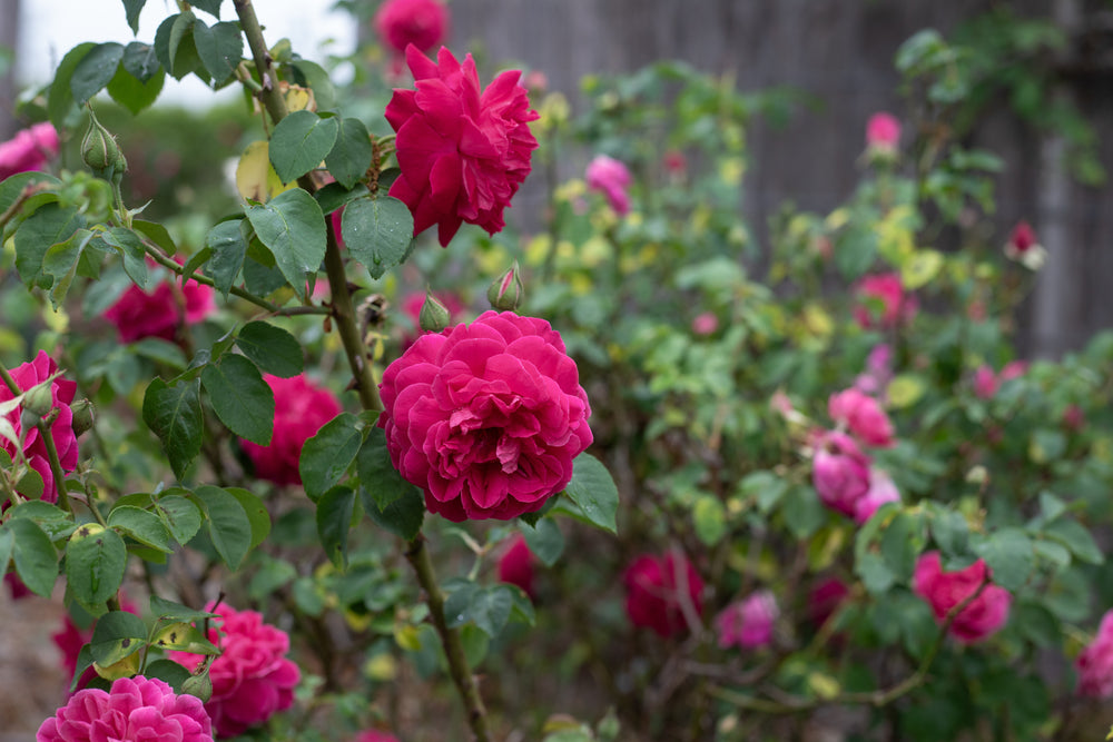 Also known as the ‘Chinquapin Rose’ and ‘Burr Rose’, this very double, garden form of R. roxburghii was introduced before the wild, single form because the interior of China was inaccessible to Europeans in the early 1800s. William Roxburgh, an assistant surgeon to the East India Co., came across this rose in a garden in Canton, China, where it had been grown for generations as ‘Hoi-tong-hong’. He sent it to the Calcutta Botanic Garden. From there it reached England in 1820 and quickly traveled on to America. We find it lingering in many old Southern gardens. The ‘Chestnut Rose’ is unique in many ways. The pink, lightly fragrant flowers open from mossy-looking buds irregularly throughout the growing season and are followed by bristly, globular hips that resemble chestnut burrs. The odd, pale brown bark of the branches, combined with leaves divided into many small leaflets (as many as 15), makes this rose a fascinating specimen plant, especially if allowed to reach its mature size.