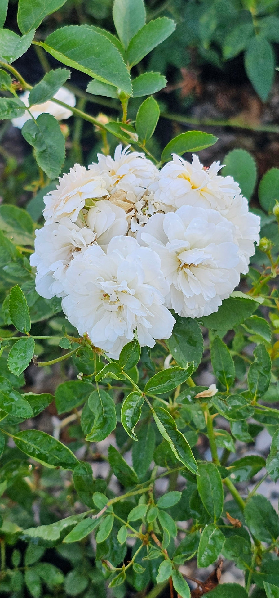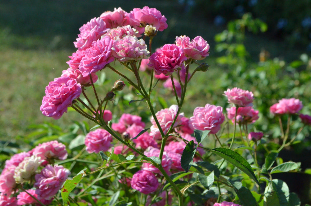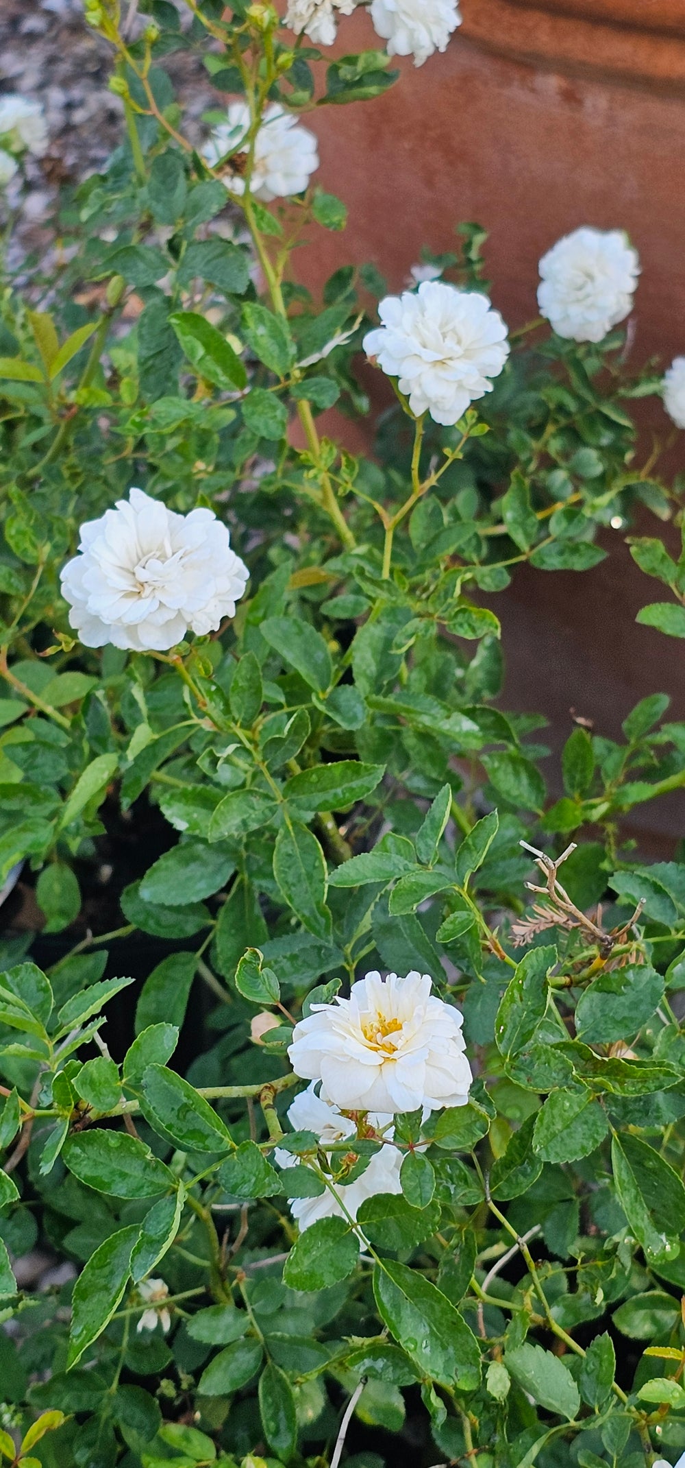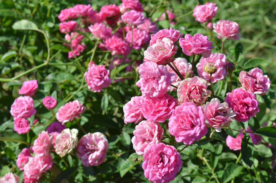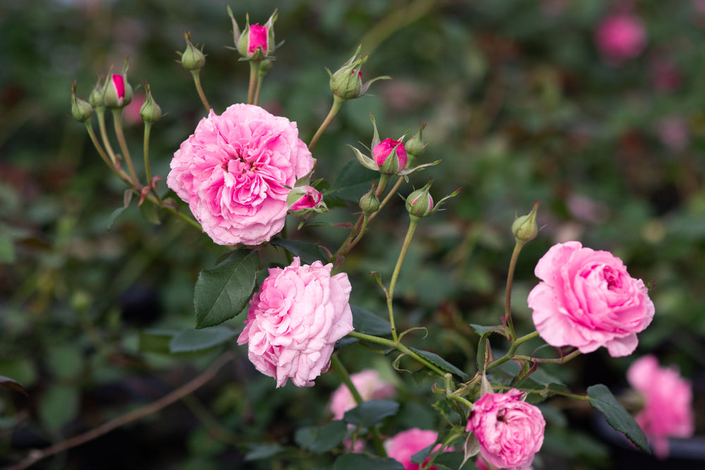 Small pink rose bush with 4 blooms and 5 rose buds.