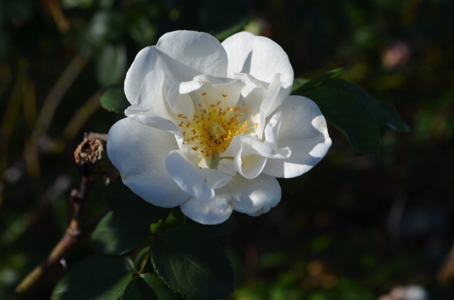 Gideon Lincecum's' best quality is its very dark foliage that acts as a foil to its single white flowers. Plants attain heights to six feet but are very bushy and thick. Few thorns and lots of hips make it even more attractive. This rose was named after Gideon Lincecum, a 1800's plant collector.