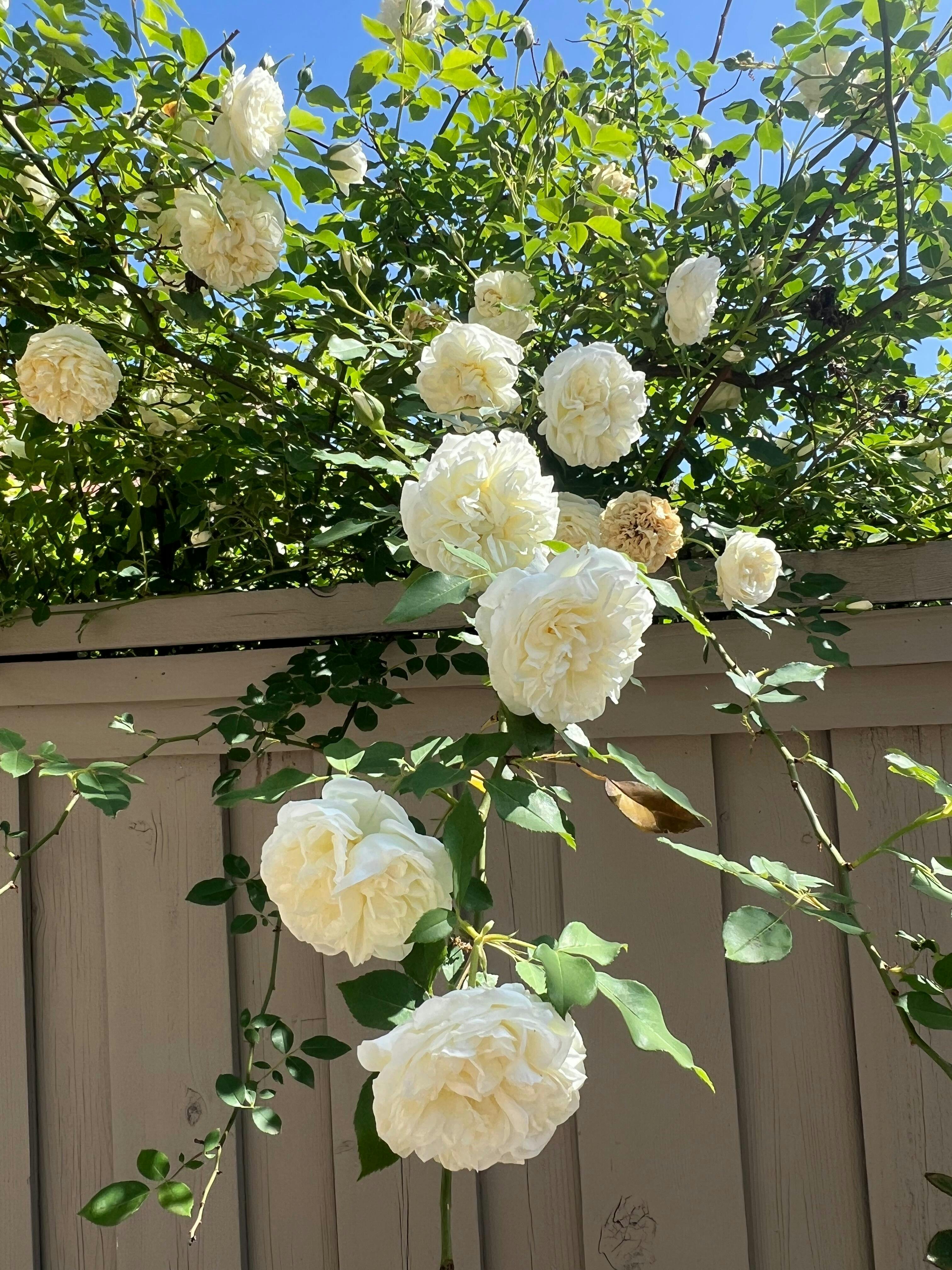 Named for General Lamarque, this rose is the result of a cross between ‘Blush Noisette’ and ‘Parks’ Yellow Tea-scented China’. A fine, vigorous climber, its flowers are of medium size, double in form, with white petals that have a touch of lemon yellow at the base. Nancy Steen, in The Charm of Old Roses, says that "the fragrance of the flowers is clean and delicious." We have had bouquets of ‘Lamarque’ on the table for Christmas Day. A superb climbing rose.