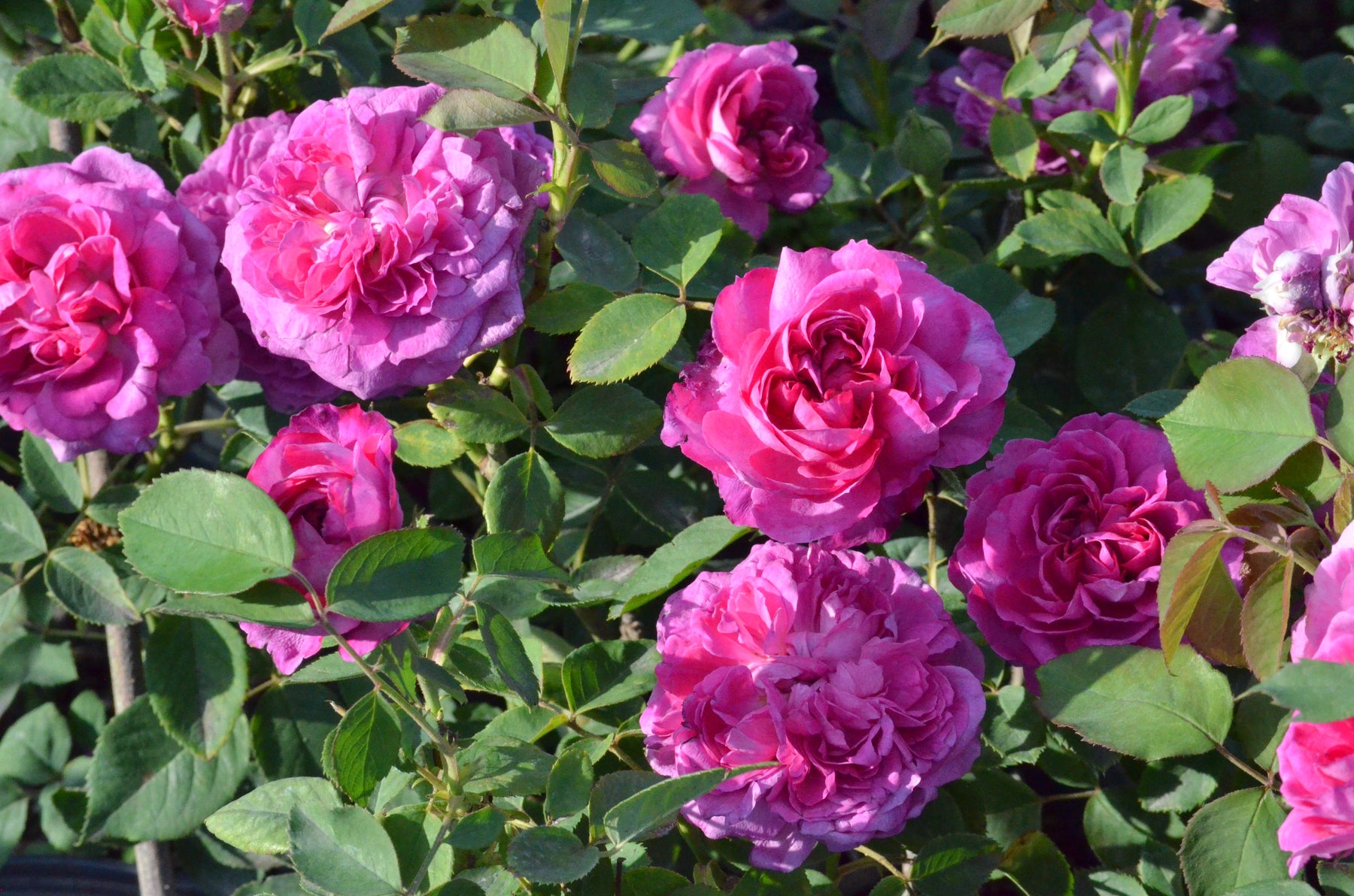 This thornless rose grows like the Bourbons but bears Gallica-like flat blooms of a muted cerise lilac. ‘Reine des Violettes’ makes a chunky bush about five feet square with glossy leaves which require hard pruning in early spring to keep it compact.