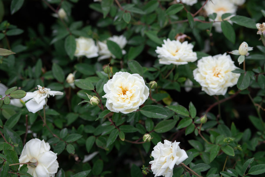 Regarded as the only white China rose, ‘Ducher’ blooms a soft ivory-white for us. The buds are very round and sometimes have a hint of pink on the outer petals opening to a delicate swirl of fragrant ivory petals. Smaller than many Chinas, this is a good candidate for a container. Although it exhibits the typical bronzy new growth, the foliage of ‘Ducher’ is uncharacteristically light green.