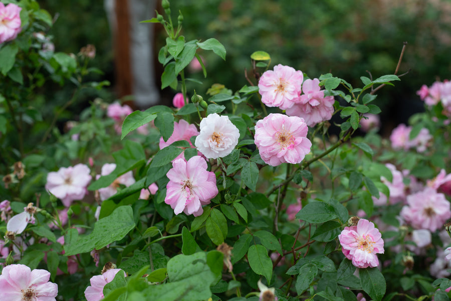 'Madame Laurette Messimy' has clusters of rounded buds that open to soft, salmon-pink, semi-double flowers with a touch of yellow at the base of the petals. Gifted with a true rose fragrance, this rose is ideal for growing in a pot where it can be easily appreciated. Strong sun burns off the fragrant oils, so make sure to "stop and smell the roses" during the morning hours.