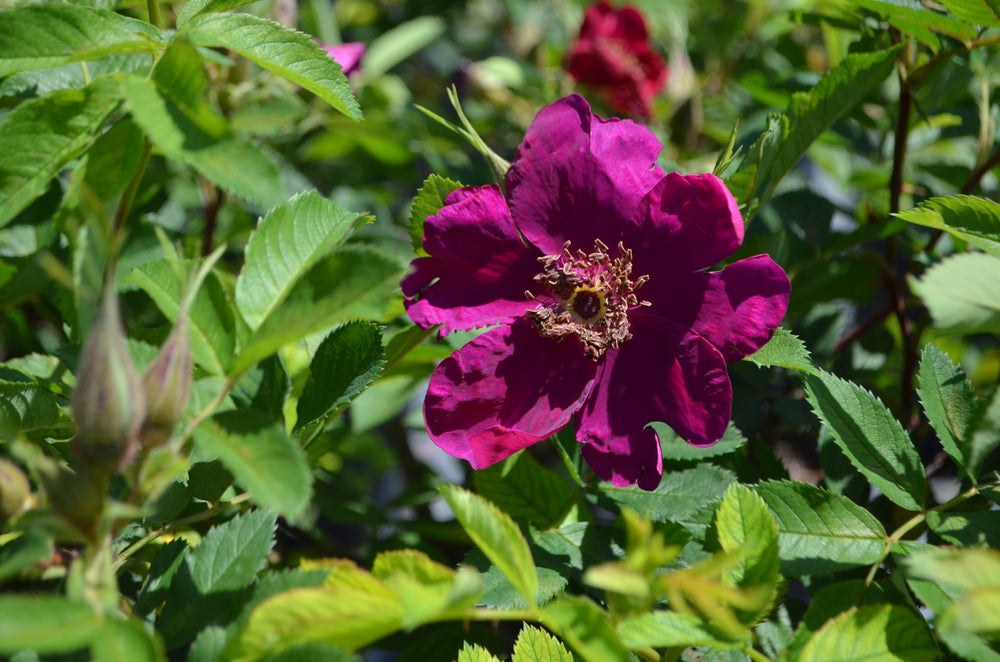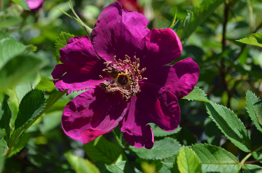 ‘Basye’s Purple Rose’ is a truly distinctive shrub rose that stands out in both color and character. Its large, single blooms of velvety fuchsia-magenta are highlighted with brilliant golden stamens; an eye-catching display that repeats in flushes throughout the growing season. The flowers carry a very light, fruity fragrance and open to an average of 2.5" in diameter with 4–8 petals, creating a simple yet strikingly elegant effect.