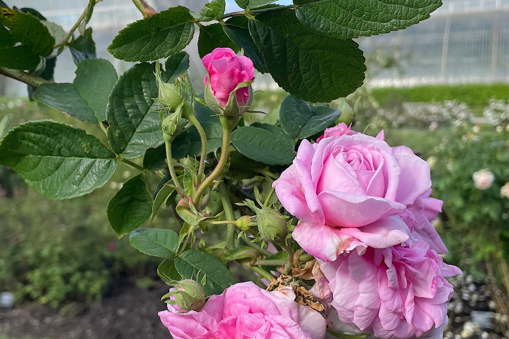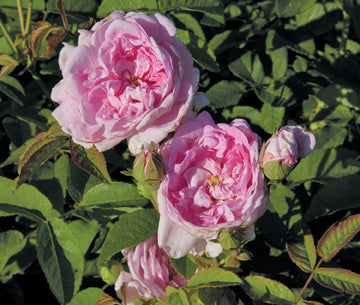 Also known as "Rose dIsfahan" or "Pompon des Princes", this paragon amongst Damask roses has been seen growing wild on the hills of Iran, especially between Shiraz and the old caravan trading center of Ispahan. Residents of Shiraz still grow it in their walled gardens, where plants and pools are a release from the hot, dry land outside. When in full bloom, 'Ispahan' is covered until it looks like a fountain of pink. The shrub is vigorous and hardy, with a slightly bluish cast to the rough green leaves.