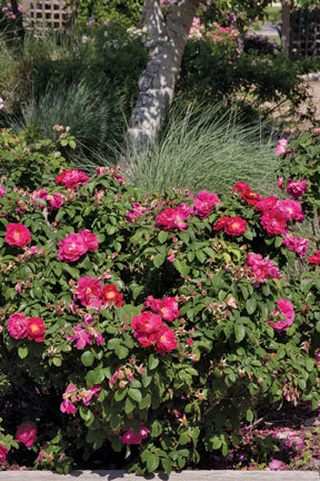 'Mrs. Anthony Waterer' is a hybrid of R. rugosa and the popular old Hybrid Perpetual, 'General Jacqueminot'. The combination has produced an intensely fragrant rose of deep crimson. The bush is broad and solid with plenty of prickles and dark green, deeply veined leaves.