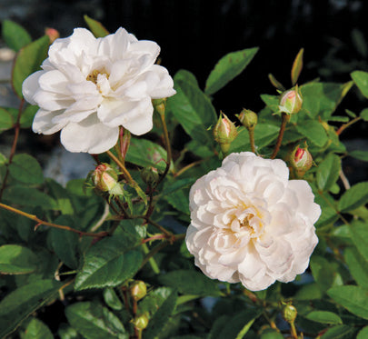 'Katharina Zeimet' was raised by Peter Lambert of Germany, who crossed 'Marie Pavie' with another Polyantha. Exceptionally neat, dark green foliage and small, double, scented white flowers and constant bloom make it particularly desirable in the landscape or as a container plant.