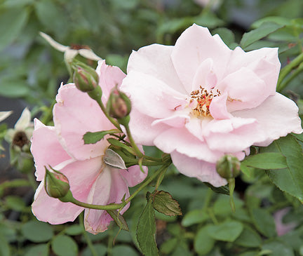 This vigorous and tall shrub of six feet produces 2 1/2 inch flowers of soft pink from spring through fall. Due to its cold hardiness, 'Mrs. San Houston' can be used in difficult areas when other roses have failed.