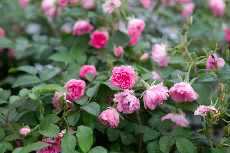 Medium, pink clusters of small-fringed blooms decorate this heavily prickled bush. Although easily maintained at five feet or more, this rose can tolerate closer pruning should a smaller height be desired. A rather vigorous bush, its typical growth habit is wider than it is tall.'Pink Grootendorst' blooms heavily and repeats throughout the season with blooms more reminiscent of carnations rather than roses, making a striking contrast to the foliage. This rose is a sport of 'F. J. Grootendorst'.