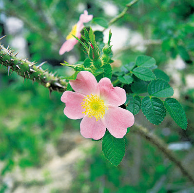 Known as the "Sweet Briar Rose" because of the strongly apple-scented leaves, this is a favorite English native that has been recorded in literature from Chaucer to Shakespeare. R. eglanteria, or 'Eglanteria', has been common in cottage gardens on both sides of the Atlantic because it is not only hardy but always fragrant, whether or not it is in bloom. The rambling shrub is large, thorny, and vigorous with dark green, slightly rough foliage. Spring flowers are pink with five petals and have a good rose fragrance of their own. R. eglanteria should be part of every fragrance garden. Rain, wind and sun all seem to bring out the perfume of the plant. If supported as a climber, it could reach 10 to 15 feet.