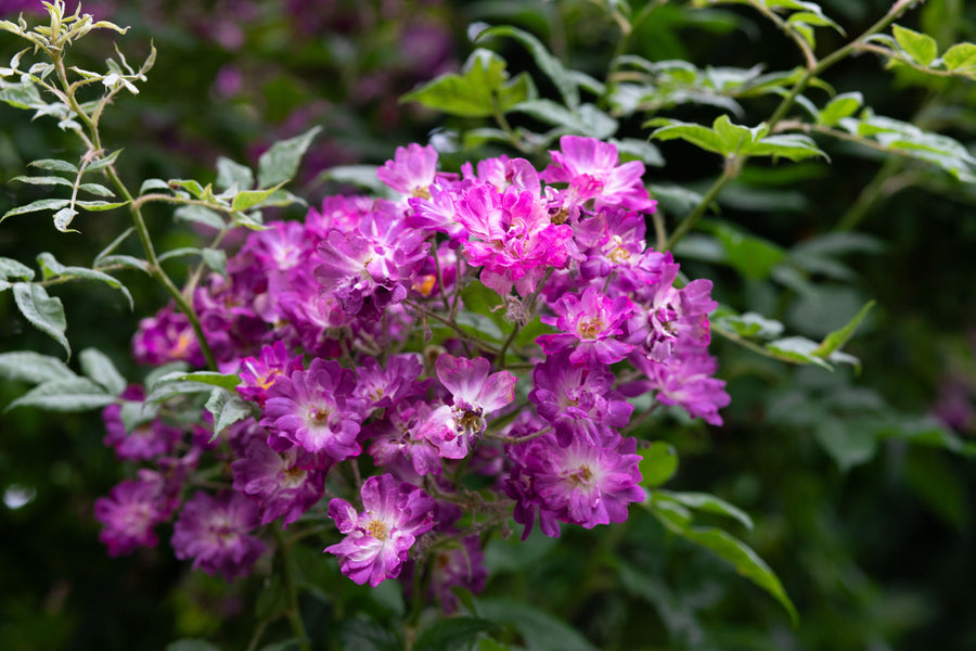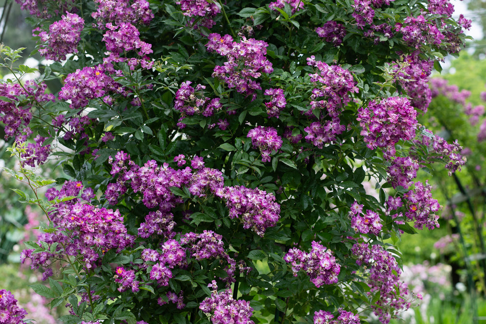 Often called "The Blue Rose", this vigorous, nearly thornless rambler has small crimson or purple blossoms that fade to a grey-blue color. Although literature indicates a tendency to re-bloom, we have not witnessed this occurrence. Seen up close, there are streaks of white in each flower and the gold stamens are brightly displayed. Fragrance is excellent.