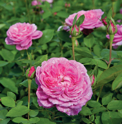 Mr. Vick found this striped flower sport on a 'Archiduchess Elisabeth d'Autriche' in his Rochester, New York garden in 1891. The flowers of 'Vick's Caprice' are large, fully double and cupped. Its most remarkable feature is the floral coloration - an irregular striping of soft pink and lilac with random flecks of white. Like its parent, it has an upright habit, soft green foliage, few thorns and an excellent fragrance. This rose is an ideal cut flower and adds interest to any floral arrangement.