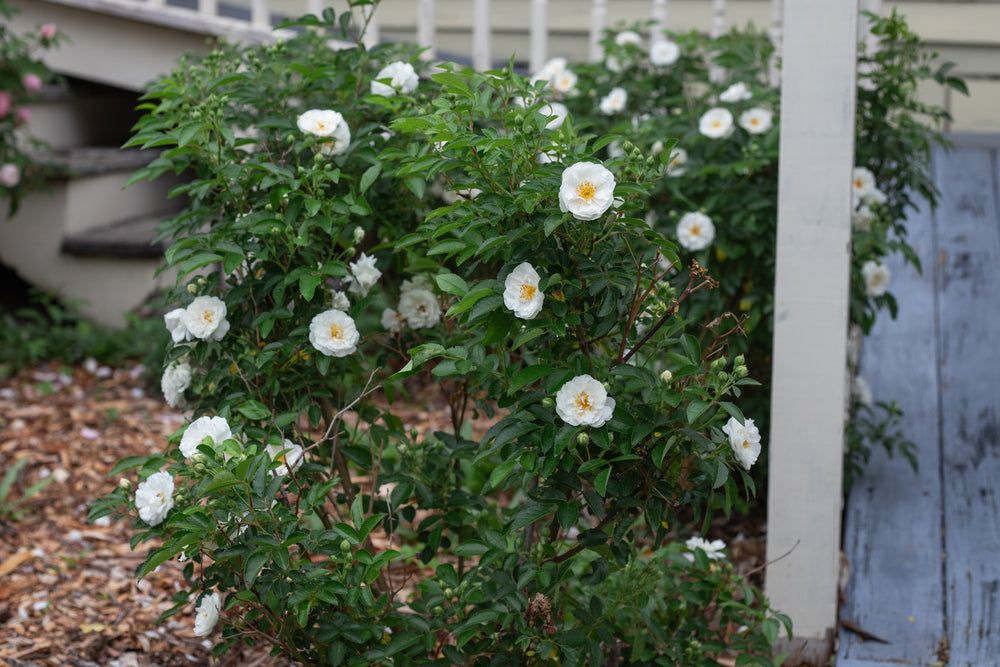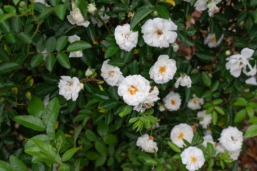 A neat and distinctive little bush, ‘Yvonne Rabier’ has long been a favorite "dwarf" rose. The clustered blooms are pure white with a slight touch of sulphur in the center. The foliage is rich and green and extra glossy.