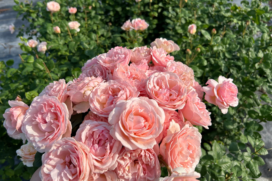 Pink rose, Basyes Blueberry, with honey bee pollinating.