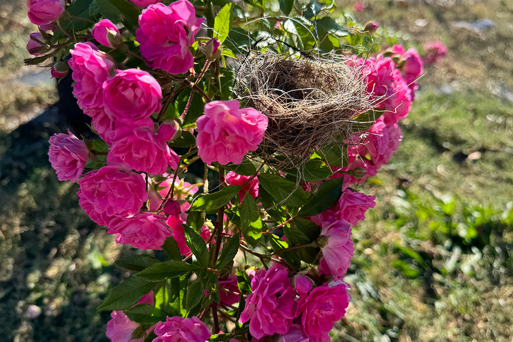 Mango Veranda rose with Blue Blossom flowers, aka California Lilac
