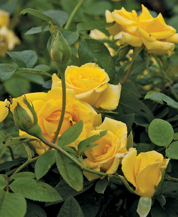'Nacogdoches' or “Grandma’s Yellow” as it is known in some circles, is a real eye catcher! The bright yellow roses appear throughout the growing season on an upright shrub and are excellent for cutting. We feel this rose is a modern Floribunda, but unlike its modern rose cousins, it has proven to be disease resistant.