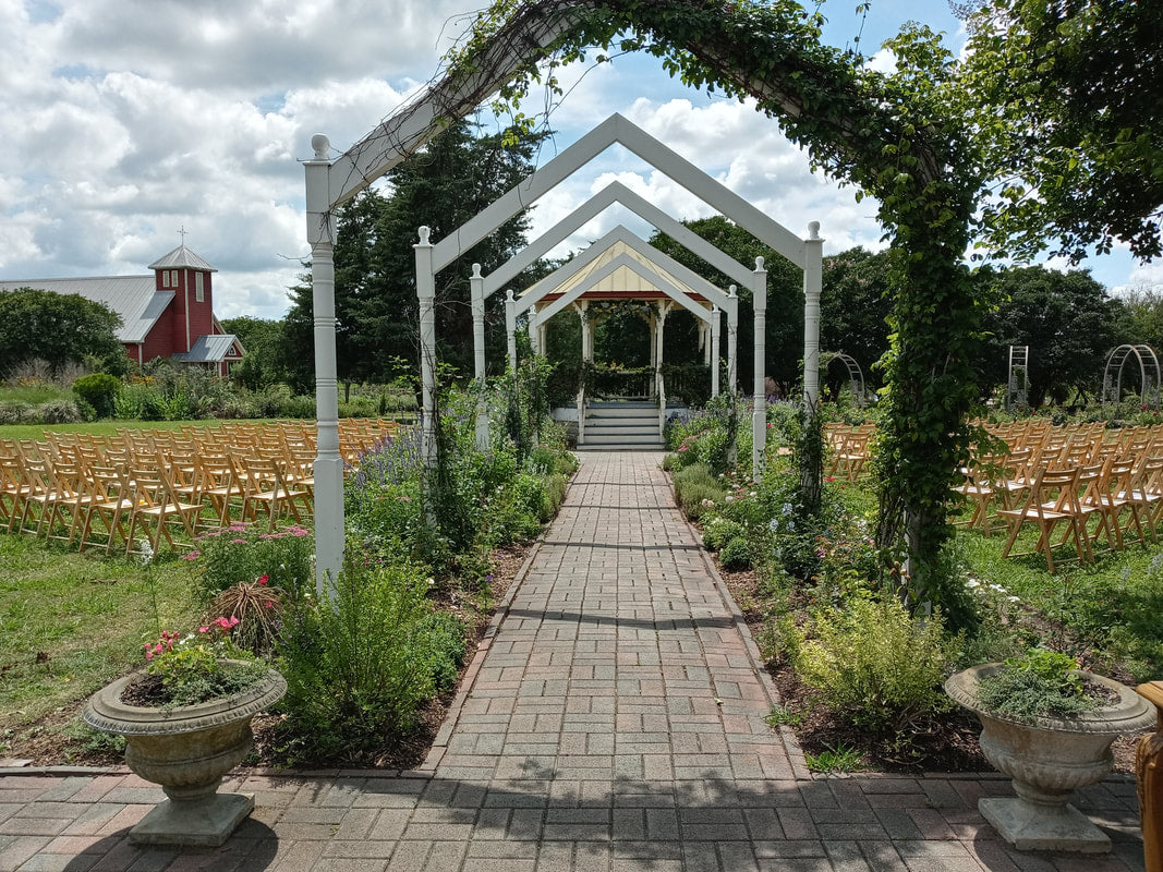 Our charming gazebo covered in climbing roses, and a picturesque garden allee, surrounded by lush, green grass provides an ideal space for a romantic outdoor ceremony.