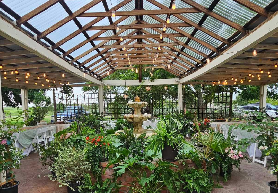 Our covered pavilion, adorned with soft string lights, complemented by the gentle sound of a charming fountain, provides a magical setting for your reception.
