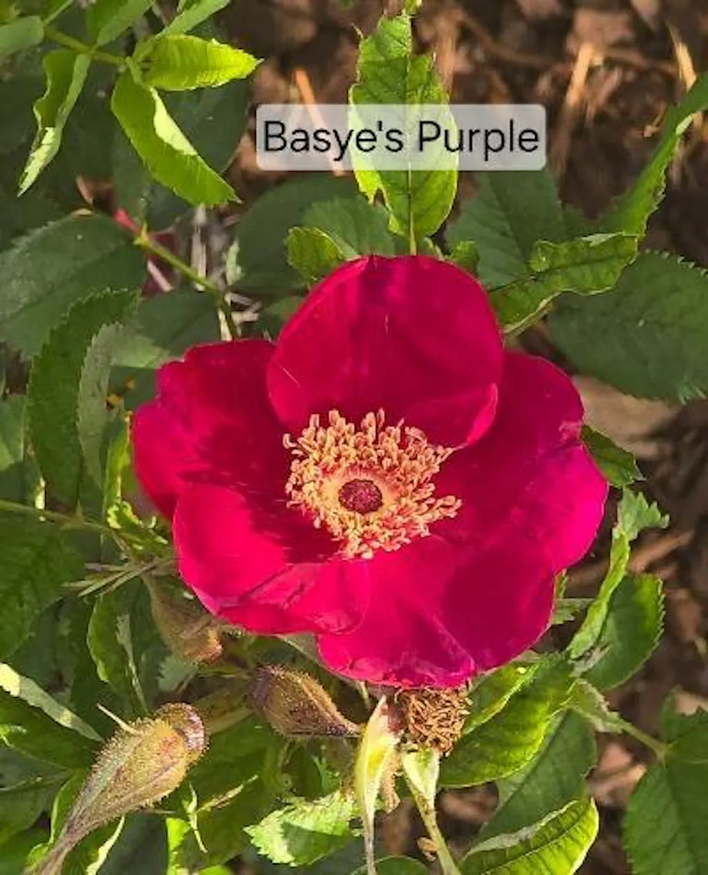 ‘Basye’s Purple Rose’ is a truly distinctive shrub rose that stands out in both color and character. Its large, single blooms of velvety fuchsia-magenta are highlighted with brilliant golden stamens; an eye-catching display that repeats in flushes throughout the growing season. The flowers carry a very light, fruity fragrance and open to an average of 2.5" in diameter with 4–8 petals, creating a simple yet strikingly elegant effect.