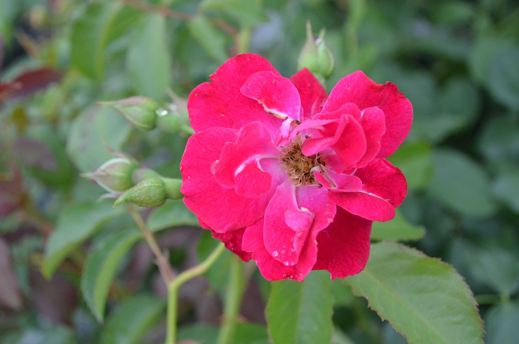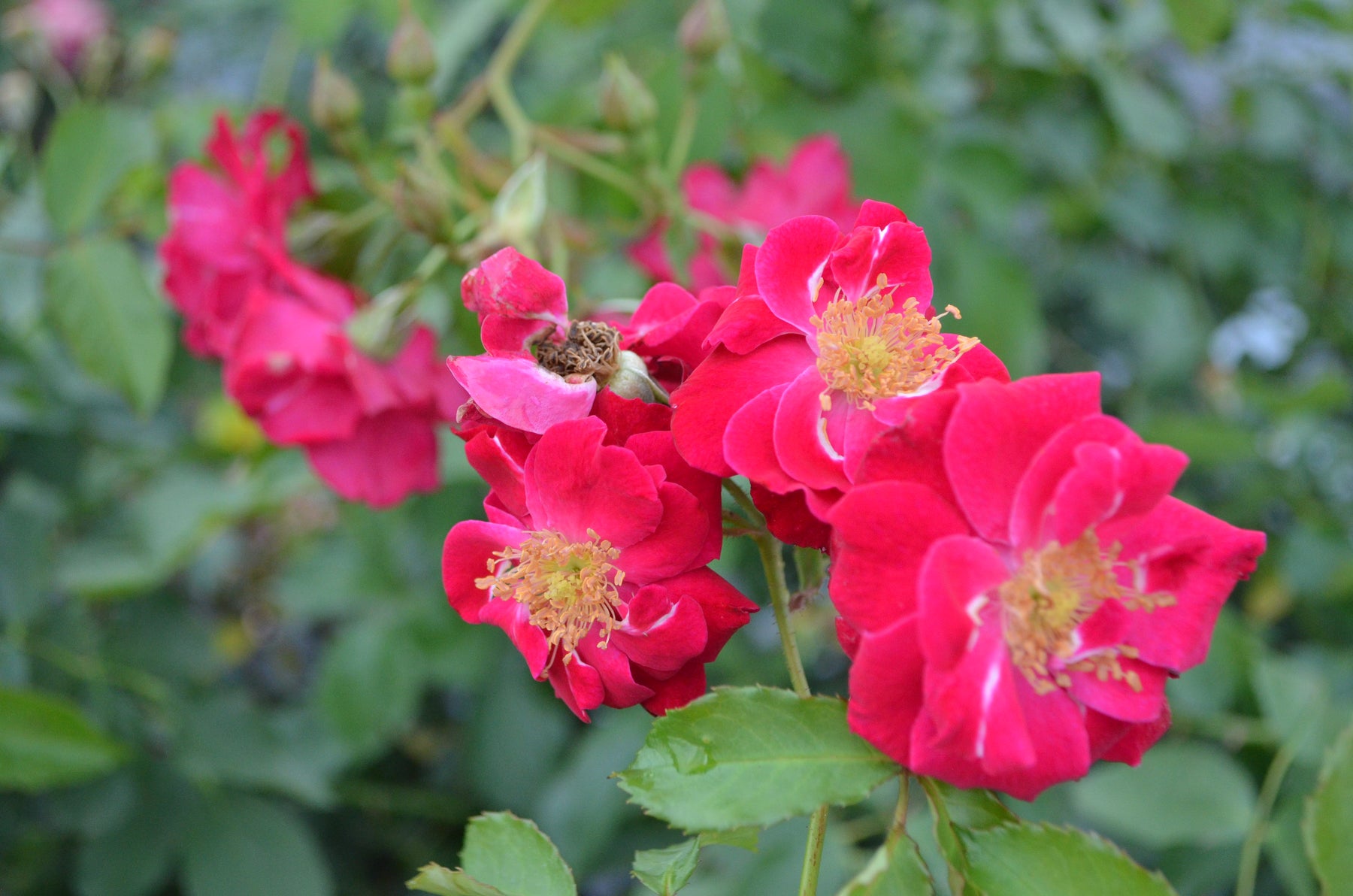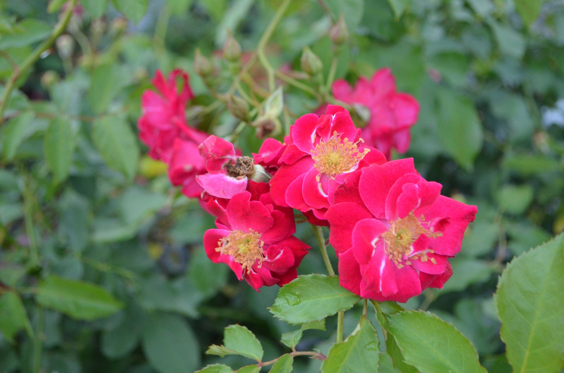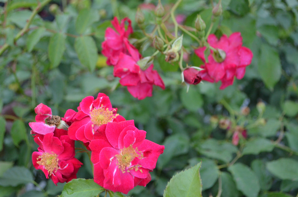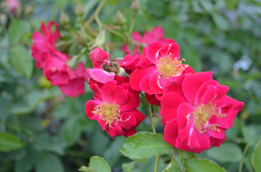 'Will Scarlet' has a versatile growth habit. It can be grown exceptionally well as a climber to 12 feet or just as effective in the landscape as an open shrub that is as broad as it is tall. The semi-double, scarlet-red flowers are slightly scented and the color is accentuated by the presence of numerous yellow stamens. The graceful long canes and flowering habit produce a fine spring display. This is followed by an equally spectacular show in the fall, leaving clusters of round orange hips to mark the start of the winter season. If grown as a climber, this rose will reach 10 to 12 feet.